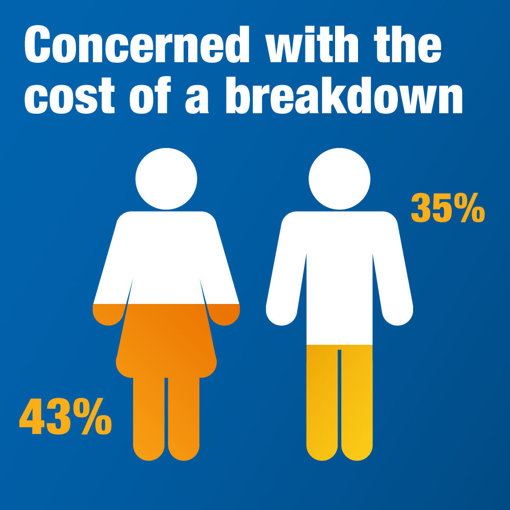 43% of women we spoke to said that they feel most concerned about the cost of repairs after a breakdown, compared to 35% of men. We did find that concern over the cost of repairs rises to 50% for those who have broken down in the last three months – indicating that the financial impact stings most in the short term, but then fades a little over time. Although that may depend on how big the bill was!