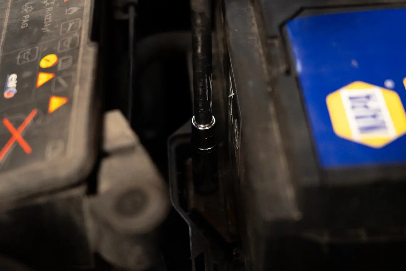 5. Locate and unbolt the hold-down clamp that secures the battery, then lift the old battery out of the battery tray.