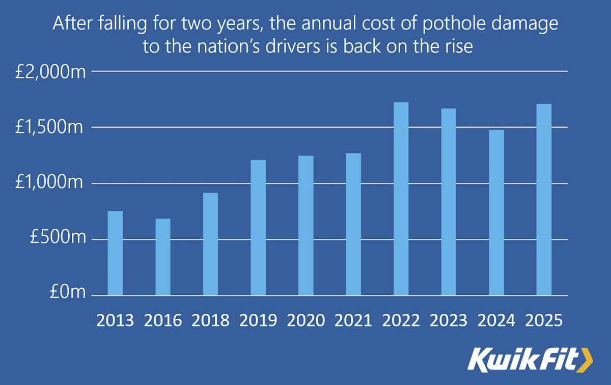 Cost of pothole damage rises to £1.7bn - Reversing two year drop